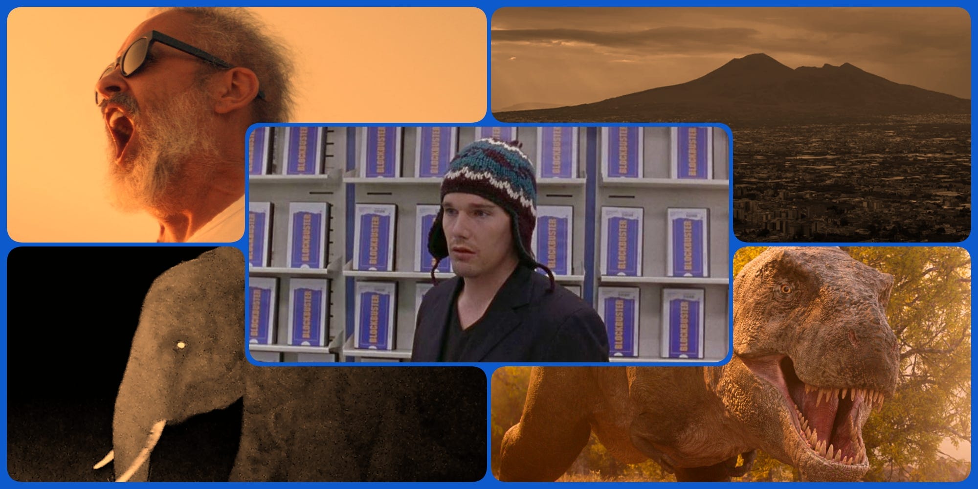 As a clip show, Videoheaven both benefits and suffers from Perry’s apparent completionism. I have the same issue, so I’m forgiving, and I wanted to see certain scenes that came to mind as illustrative. For the sake of streamlining points, Perry didn’t need to include everything he could find, but he and editor Clyde Folley clearly had fun making trivial connections, as in the many cases where movies and shows featuring the same actor are lined up together in the cut. From the start, having narrator Maya Hawke voice a scripted introduction tied to her own father’s Blockbuster-set scene in Michael Almereyda’s Hamlet, Perry showed that he’d be a bit cheeky with his form. She later appears on screen, too, in scenes from Stranger Things.